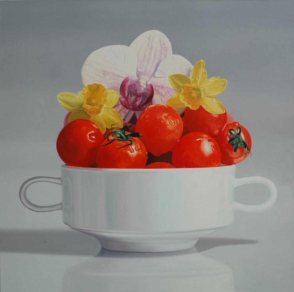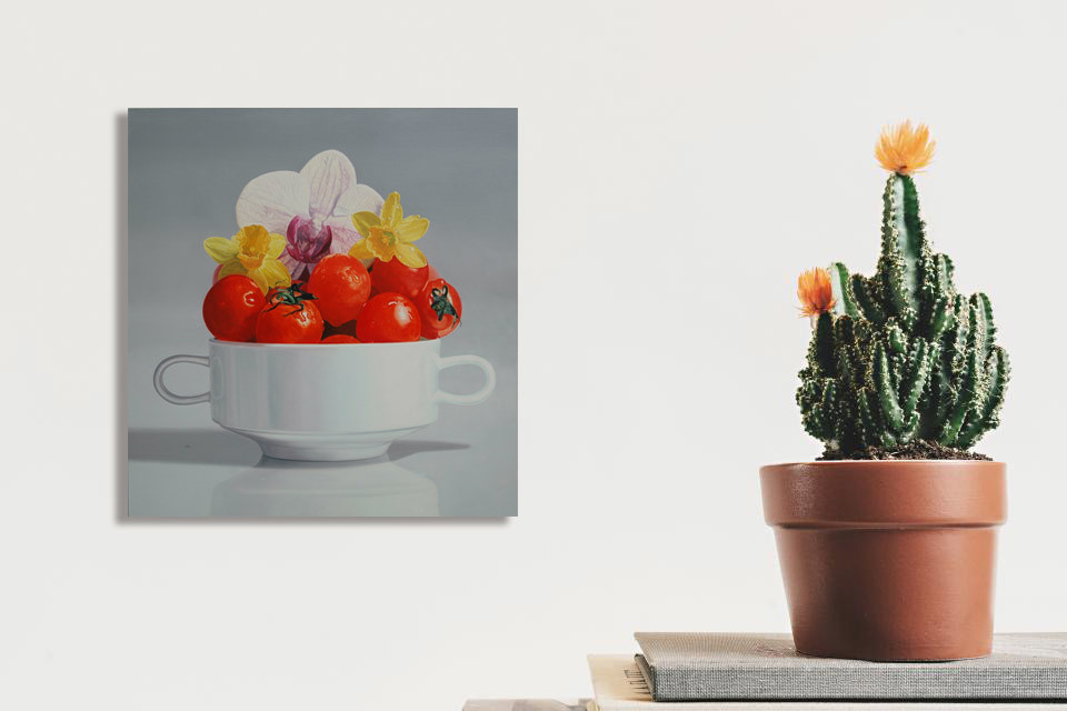 캔버스 안에 꽃과 과일이 등장하면서 우리는 기쁨과 풍요로움을 느낄수 있다. 풍요로움이란 인간의 욕망이 충족되어질 때 느끼는 감정이기에