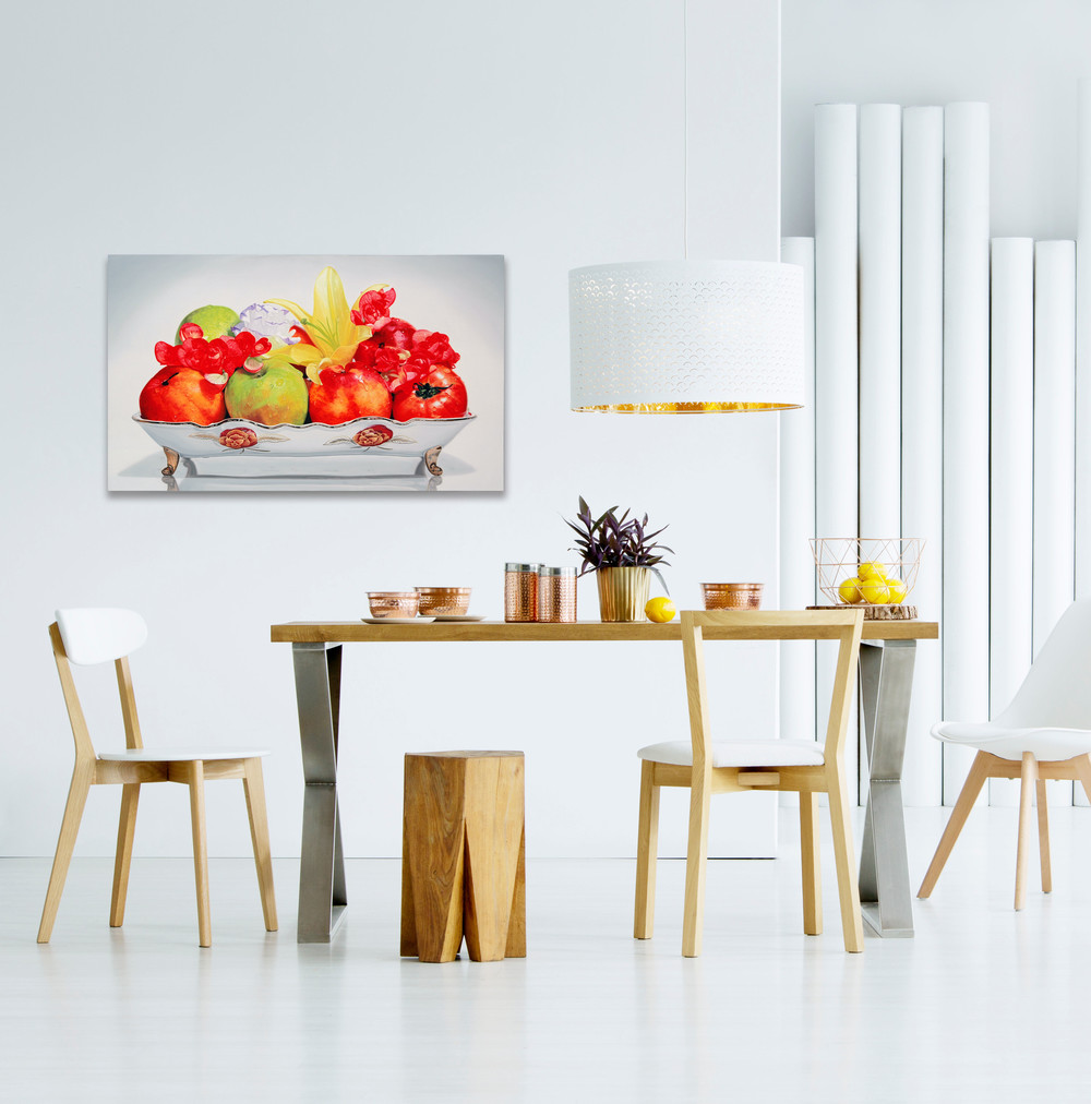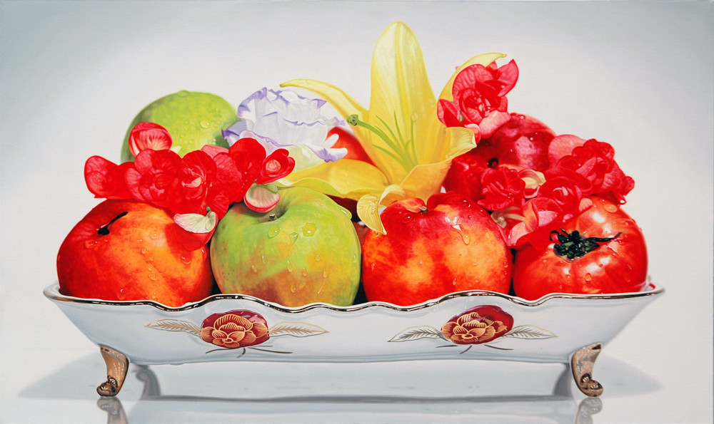 캔버스 안에 꽃과 과일이 등장하면서 우리는 기쁨과 풍요로움을 느낄수 있다. 풍요로움이란 인간의 욕망이 충족되어질 때 느끼는 감정이기에