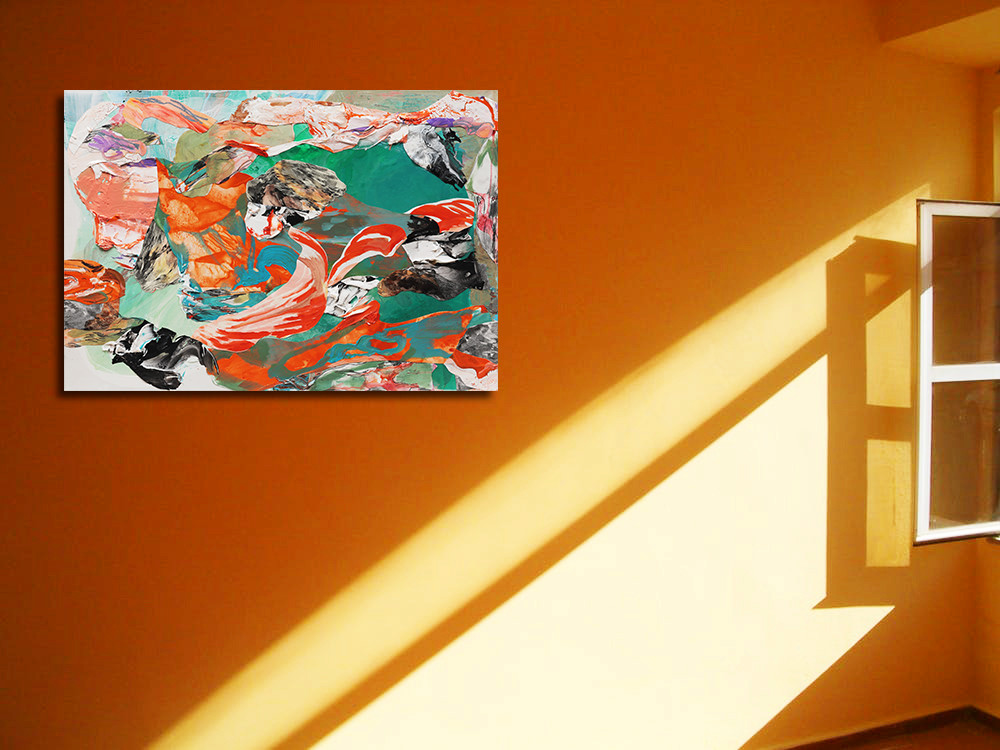 강렬한 색상으로 꼴라쥬되어 이목을 끌 수 있는 작품으로 호텔 로비에 추천하는 작품이다.